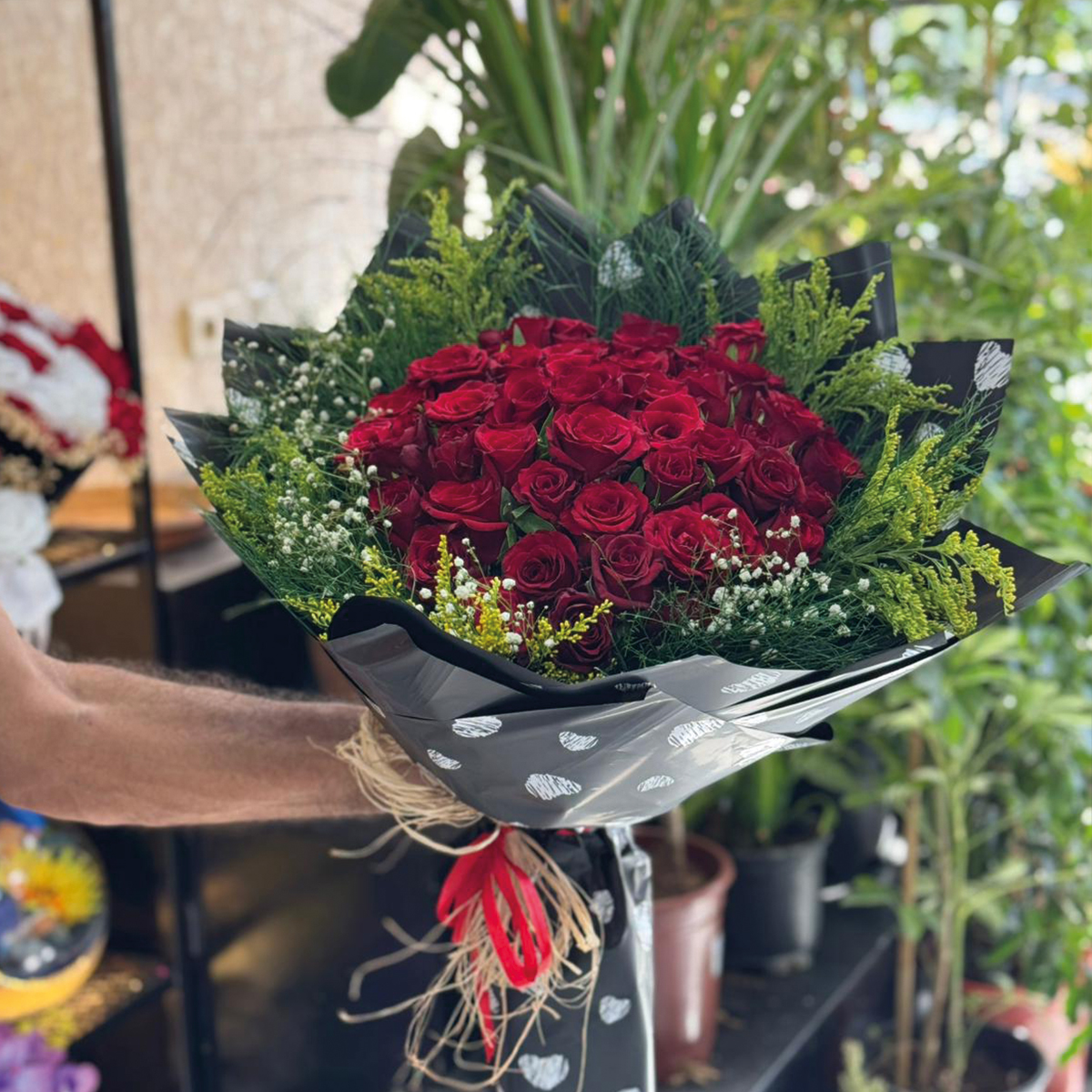 51 adet taze ve canlı kırmızı gül, özel anlar için şık bir buket.