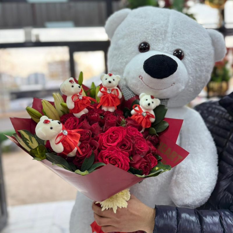 beyaz peluş ayıcık, 21 adet taze gül ve etrafa zarafet katan küçük ayıcıklar ile göz kamaştırıyor.
